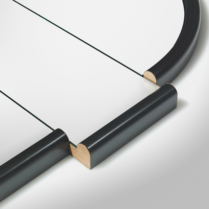 One of the most evident characteristics of both mirrors is the precise cut slice, which when shifted from its original position, unveils an oak trimmed section, that matches perfectly with the black frame of the mirrors.