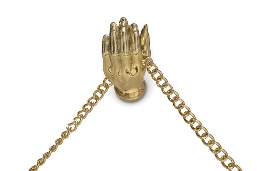This mirror is enhanced by the touch of a delicate cast brass hand holding a chain in its palm.