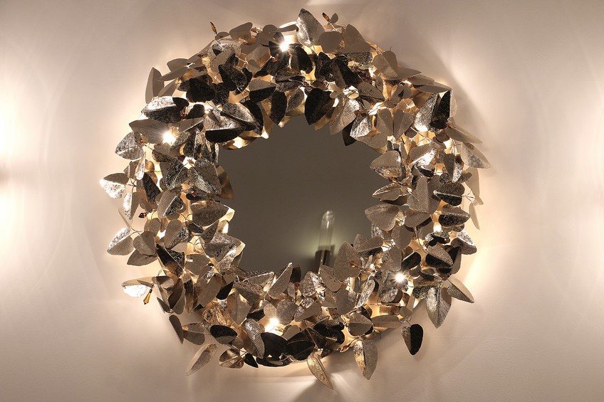 The luxurious McQueen mirror displays a magnificent foliage is made of hammered brass with gold plated finish and a rhythmic luminosity of the Swarovski crystals.