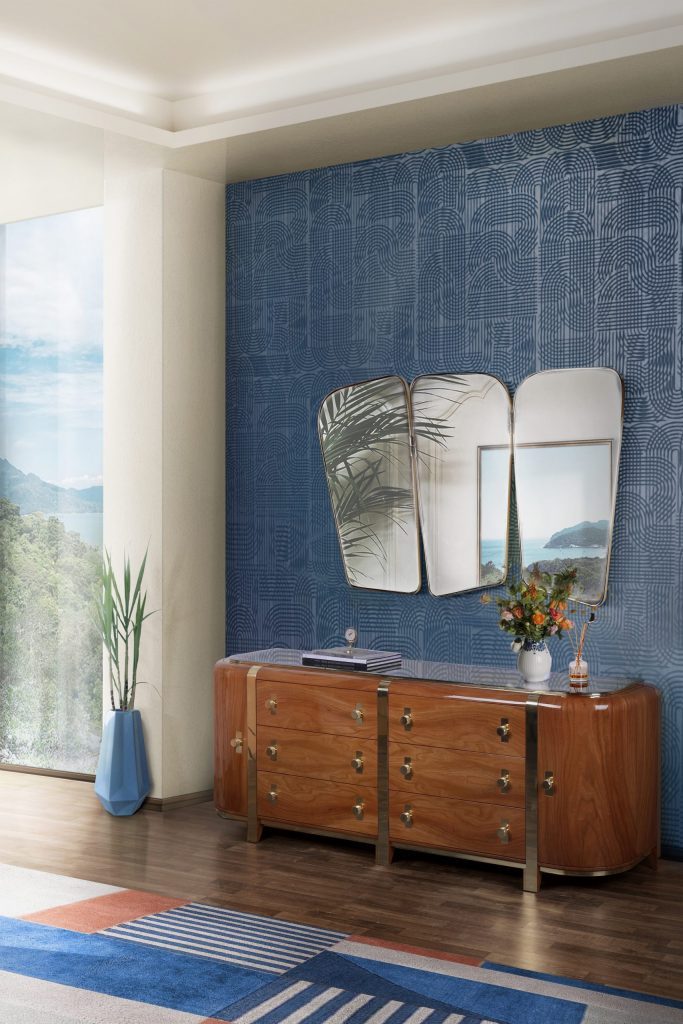 Still, on a Modern Mid-Century note, the details of the decor are crucial to complete any setting. A few accessories throughout the room unveiling the color trend of the year are perfect, but there are some pieces that steal the show. The Wilde wall mirror features three panels and irregular shapes with a golden strap of plated brass that evokes a mid-century modern style.