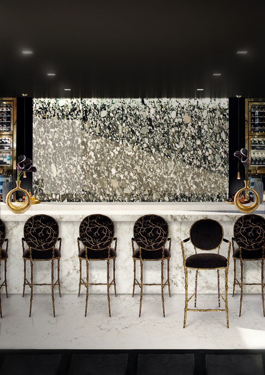 The Enchanted bar stool displays an antique gilded branch which is complemented by a cast brass oxidised by a gold-plated frame.