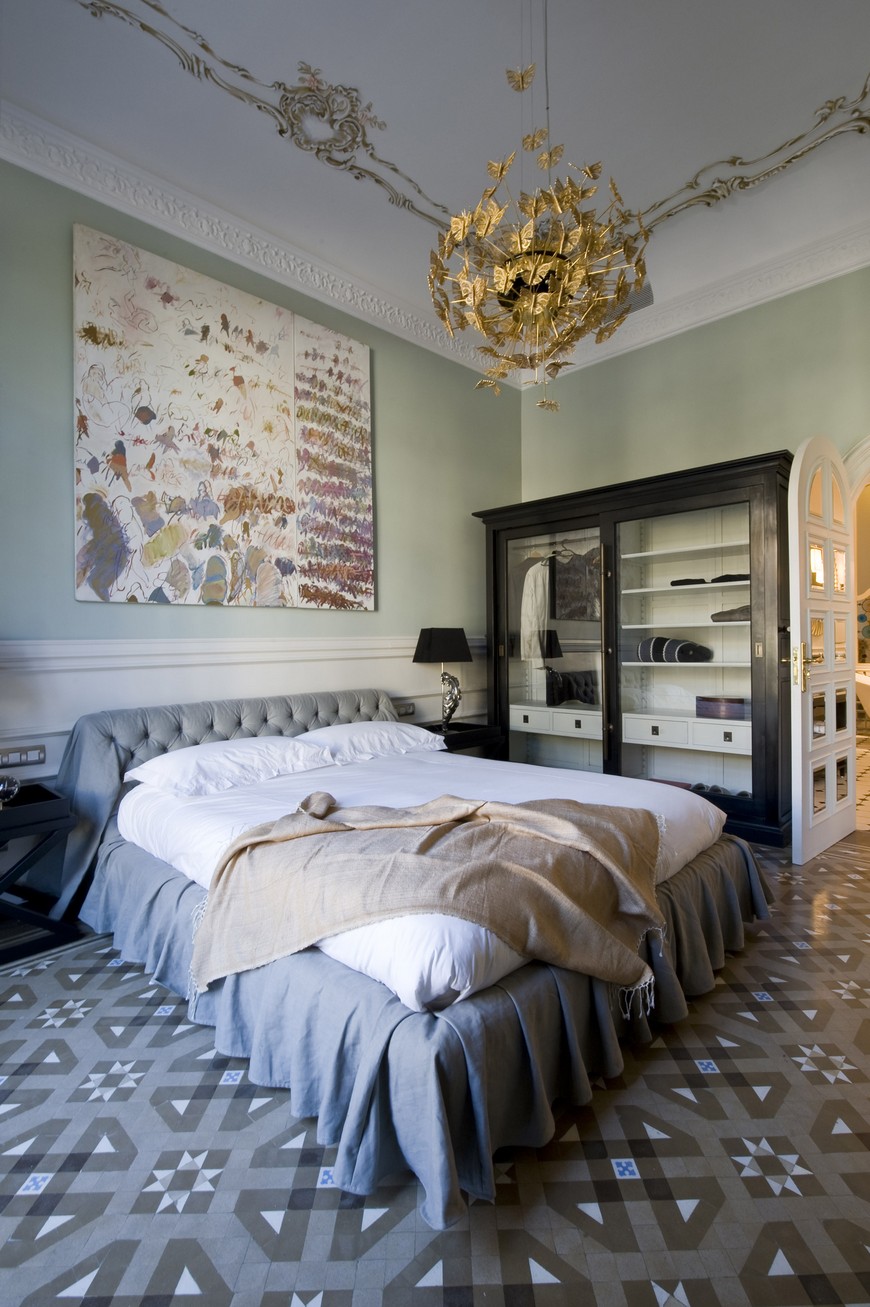Highlighting this bedroom design, the whimsical Nymph chandelier embraces the wild side of the Butterfly which so gracefully bejewels this lighting fixture.